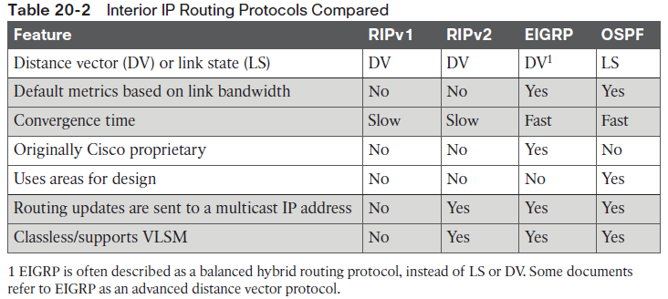 NOTE As an aside, many documents refer to EIGRP’s support for learning IPv4 routes simply as EIGRP, and EIGRP support for IPv6 as EIGRPv6. This book follows that same convention. OSPF RFCs define specific versions, OSPF Version 2 (OSPFv2) learning IPv4 routes, and OSPF Version 3 (OSPFv3) learning IPv6 routes.Comparing IGPsWhat is an IGP in the first place? All the routing protocols mentioned so far in this chapter happen to be categorized as Interior Gateway Protocols (IGPs) rather than as Exterior Gateway Protocols (EGPs). First, the term gateway was used instead of router in the early days of IP routing, so the terms IGP and EGP really do refer to routing protocols. The designers of some routing protocols intended the routing protocol for use inside one companyor organization (IGP), with other routing protocols intended for use between companies and between Internet service providers (ISPs) in the Internet (EGPs).When deploying a new network, the network engineer can choose between a variety of IGPs. Today, most enterprises use EIGRP and OSPFv2. RIPv2 has fallen away as a serious competitor, in part due to its less robust hop-count metric, and in part due to its slower (worse) convergence time.A few key comparison points are as follows:■ The underlying routing protocol algorithm: Specifically, whether the routing protocol used logic referenced as distance vector (DV) or link state (LS).■ The usefulness of the metric: The routing protocol chooses which route is best based on its metric; so the better the metric, the better the choices made by that routing protocol.■ The speed of convergence: How long does it take all the routers to learn about a change in the network and update their IPv4 routing tables? That concept, called convergence time, varies depending on the routing protocol.■ Whether the protocol is a public standard or a vendor-proprietary function: RIP and OSPF happen to be standards, defined by RFCs. EIGRP happens to be defined by Cisco, and until 2013, was kept private.For example, RIP uses a basic metric of hop count. Hop count treats each router as a hop, so the hop count is the number of other routers between a router and some remote subnet. RIP’s hop-count metric means that RIP picks the route with the smallest number of links and routers. However, that shortest route may have the slowest links; a routing protocol that uses a metric based in part on link speed (called bandwidth) might make a better choice. In contrast, EIGRP’s metric calculation uses a math formula that gives routes with slow links a worse metric, and routes with fast links a lower metric, so EIGRP prefers faster routes.As you can see on the left in the figure, RIP on router B chooses the shorter hop route over the top of the network, over the single link, even though that link runs at 1 Gbps. EIGRP, on the right side of the figure, chooses the route that happens to have more links through the network, but both links have a faster bandwidth of 10 Gbps.