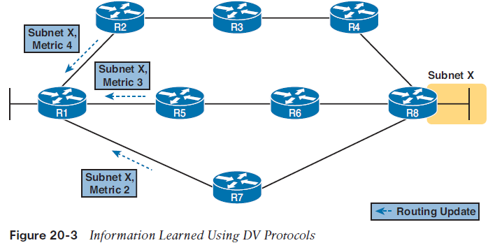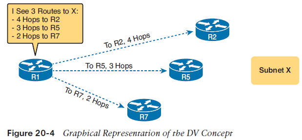 DV protocols learn two pieces of information about a possible route to reach a subnet:■ The distance (metric)■ The vector (the next-hop router)Figure 20-4 gives a better view into R1’s DV logic. The figure shows R1’s three competing routes to subnet X as vectors, with longer vectors for routes with larger metrics. R1 knows three routes, each with Distance: The metric for a possible route Vector: The direction, based on the next-hop router for a possible route