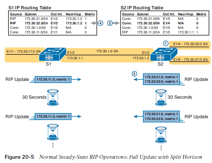 Full Update Messages and Split Horizon Some DV protocols, such as RIP (both RIPv1 and RIPv2), send periodic full routing updates based on a relatively short timer. Specifically, full update means that a router advertises all its routes, using one or more RIP update messages, no matter whether the route has changed or not. So, if a route does not change for months, the router keeps advertising that same route over and over. Figure 20-5 illustrates this concept in an internetwork with two Nexus switches configured as Layer 3 switches, with four total subnets. The figure shows both routers’ full routing tables, and lists the periodic full updates sent by each router. This figure shows a lot of information, so take the time to work through the details. For example, consider what switch S1 learns for subnet 172.30.22.0/24, which is the subnet connected to S2’s E1/4 interface: 1. S2 interface E1/4 has an IP address, and is in an up/up state.2. S2 adds a connected route for 172.30.22.0/24, off interface E1/4, to R2’s routing table.3. S2 advertises its route for 172.30.22.0/24 to S1, with metric 1, meaning that S1’s metric to reach this subnet will be metric 1 (hop count 1). 4. S1 adds a route for subnet 172.30.22.0/24, listing it as a RIP learned route with metric 1.
