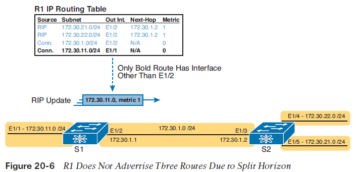 Monitoring Neighbor State with Periodic RIP UpdatesRIPv1 and RIPv2 also send periodic updates, as shown in the bottom of Figure 20-5. That means that each router sends a new update (a full update) on a relatively short time period (30 seconds with RIP).Many of the early DV protocols used this short periodic timer, repeating their full updates, as a way to let each router know whether a neighbor had failed. Routers need to react when a neighboring router fails or if the link between two routers fails. If both routers on a link must send updates every 30 seconds, when a local router no longer receives those updates, it knows that a problem has occurred, and it can react to converge to use alternate routes.Split HorizonFigure 20-5 also shows a common DV feature called split horizon. Note that both routers list all four subnets in their IP routing tables. However, the RIP update messages do not list four subnets. The reason? Split horizon. Split horizon is a DV feature that tells a router to omit some routes from an update sent out an interface. Which routes are omitted from an update sent out interface X? The routes that would like interface X as the outgoing interface. Those routes that are not advertised on an interface usually include the routes learned in routing updates received on that interface. Split horizon is difficult to learn by reading words, and much easier to learn by seeing an example. Figure 20-6 continues the same example as Figure 20-5, but focusing on S1’s RIP update sent out S1’s E1/2 interface to S2. Figure 20-6 shows S1’s routing table with three light-colored routes, all of which list E1/2 as the outgoing interface. When building the RIP update to send out E1/2, split-horizon rules tell S1 to ignore those light-colored routes. Only the bold route, which does not list E1/2 as an outgoing interface, can be included in the RIP update sent out E1/2.