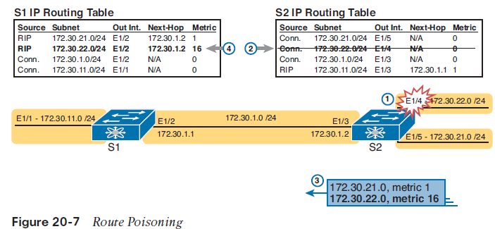 Route Poisoning DV protocols help prevent routing loops by ensuring that every router learns that the route has failed, through every means possible, as quickly as possible. One of these features, route poisoning, helps all routers know for sure that a route has failed. Route poisoning refers to the practice of advertising a failed route, but with a special metric value called infinity. Routers consider routes advertised with an infinite metric to have failed. Figure 20-7 shows an example of route poisoning with RIP, with S2’s E1/4 interface failing, meaning that S2’s route for 172.30.22.0/24 has failed. RIP defines infinity as 16. Figure 20-7 shows the following process: 1. S2’s E1/4 interface fails.2. S2 removes its connected route for 172.30.22.0/24 from its routing table.3. S2 advertises 172.30.22.0 with an infinite metric (which for RIP is 16).4. Depending on other conditions, S1 either immediately removes the route to 172.30.22.0 from its routing table, or marks the route as unusable (with an infinite metric) for a few minutes before removing the route.