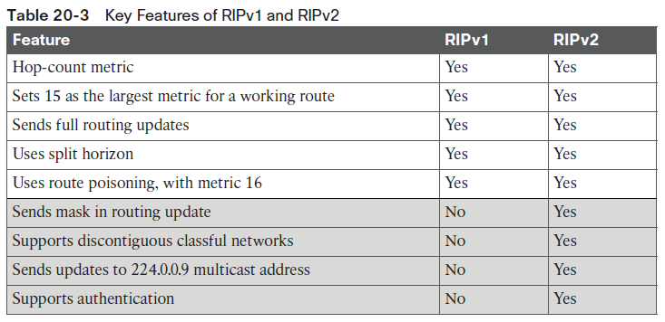 By the end of this process, router S1 knows for sure that its old route for subnet 172.30.22.0/24 has failed, which helps S1 avoid introducing looping IP routes.Each routing protocol has its own definition of an infinite metric. RIP uses 16, as shown in the figure, with 15 being a valid metric for a usable route. EIGRP has long used 2^32 – 1 as infinity (a little more than 4 billion), with some Cisco products bumping that value to 2^56 – 1 (more than 10^16). OSPFv2 uses 2^24 – 1 as infinity.RIP Concepts and OperationThe Routing Information Protocol (RIP) was the first commonly used IGP in the history of TCP/IP. Organizations used RIP inside their networks commonly in the 1980s, and into the 1990s. RIPv2, created in the mid-1990s, improved RIPv2, giving engineers an option for easy migration and co-existence to move from RIPv1 to the better RIPv2Features of Both RIPv1 and RIPv2Like all IGPs, both RIPv1 and RIPv2 perform the same core features. That is, when using either RIPv1 or RIPv2, a router advertises information to help other routers learn routes; a router learns routes by listening to messages from other routers; a router chooses the best route to each subnet by looking at the metric of the competing routes; and the routing protocol converges to use new routes when something changes about the network.RIPv1 and RIPv2 use the same logic to achieve most of those core functions. The similarities include the following:■ Both send regular full periodic routing updates on a 30-second timer, with full meaning that the update messages include all known routes.■ Both use split-horizon rules, as shown in Figure 20-6.■ Both use hop count as the metric.■ Both allow a maximum hop count of 15.■ Both use route poisoning as a loop-prevention mechanism (see Figure 20-7), with hop count 16 used to imply an unusable route with an infinite metric.Differences Between RIPv1 and RIPv2Of course, RIPv2 needed to be better than RIPv1 in some ways, otherwise, what is the point of having a new version of RIP? RIPv2 made many changes to RIPv1: solutions to known problems, improved security, and new features as well. However, while RIPv2 improved RIP beyond RIPv1, it did not compete well with OSPF and EIGRP, particularly due to somewhat slow convergence compared to OSPF and EIGRP.First, RIPv1 had one protocol feature that prevented it from using variable-length subnet masks (VLSMs). To review, VLSM means that inside one classful network (one Class A, B, or C network), that more than one subnet mask is used. For instance, in Figure 20-8, all the subnets are from Class A network 10.0.0.0, but some subnets use a /24 mask, whereas others use a /30 mask.
