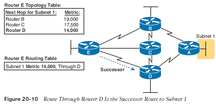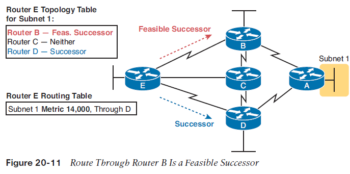The upper left shows router E’s topology table information about the three competing routes to reach subnet 1: a route through router B, another through router C, and another through router D. The metrics in the upper left show the metrics from router E’s perspective, so router E chooses the route with the smallest metric: the route through next-hop router D. EIGRP on router E places that route, with next-hop router D, into its IP routing table, represented on the lower left of the figure.NOTE EIGRP calls the best route to reach a subnet the successor route.At the same time, EIGRP on router E uses additional topology information to decide whether either of the other routes—the routes through B and C—could be used if the route through router D fails, without causing a loop. Ignoring the details of how router E decides, imagine that router E does that analysis, and decides that E’s route for subnet 1 through router B could be used without causing a loop, but the route through router C could not. Router E would call that route through router B a feasible successor route, as noted in Figure 20-11.
