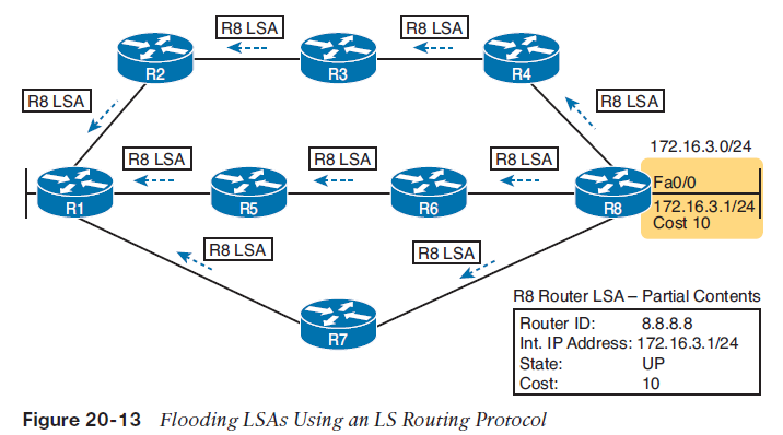 LS protocols rely on having all routers knowing the same view of the network topology and link status (link state) by all having a copy of the LSDB. The idea is like giving all routers a copy of the same updated road map. If all routers have the exact same road map, and they base their choices of best routes on that same road map, then the routers, using the same algorithm, will never create any routing loops. To create the LSDB, each router will create some of the LSAs needed. Each router floods both the LSAs it creates, plus others learned from neighboring routers, so that all the routers have a copy of each LSA. Figure 20-13 shows the general idea of the flooding process, with R8 creating and flooding an LSA that describes itself (called a router LSA). The router LSA for router R8 describes the router itself, including the existence of subnet 172.16.3.0/24, as shown on the right side of the figure. (Note that Figure 20-13 actually shows only a subset of the information in R8’s router LSA.)