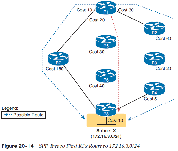Figure 20-13 shows the rather basic flooding process, with R8 sending the original LSA for itself and with the other routers flooding the LSA by forwarding it until every router has a copy. The flooding process has a way to prevent loops so that the LSAs do not get flooded around in circles. Basically, before sending an LSA to yet another neighbor, routers communicate and ask “do you already have this LSA?” Then they avoid flooding the LSA to neighbors that already have it.Applying Dijkstra SPF Math and OSPF Metrics to Find the Best RoutesAll LS protocols use a type of math algorithm called the Dijkstra shortest path first (SPF) algorithm to process the LSDB. That algorithm analyzes (with math) the LSDB, and builds the routes that the local router should add to the IP routing table—routes that list a subnet number and mask, an outgoing interface, and a next-hop router IP address.The sum of the OSPF interface costs for all outgoing interfaces in the routeThe OSPF metric for a route is the sum of the interface costs for all outgoing interfaces in the route. By default, a router’s OSPF interface cost is actually derived from the interface bandwidth: The faster the bandwidth, the lower the cost. So, a lower OSPF cost means that the interface is better than an interface with a higher OSPF cost.Armed with the facts in the previous few paragraphs, you can look at the example in Figure 20-14 and predict how the OSPF SPF algorithm will analyze the available routes and choose a best route. This figure features the logic on router R1, with its three competing routes to subnet X (172.16.3.0/24) at the bottom of the figure.