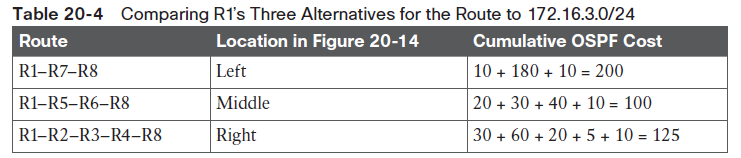 NOTE OSPF considers the costs of the outgoing interfaces (only) in each route. It does not add the cost for incoming interfaces in the route.Table 20-4 lists the three routes shown in Figure 20-14, with their cumulative costs, showing that R1’s best route to 172.16.3.0/24 starts by going through R5.