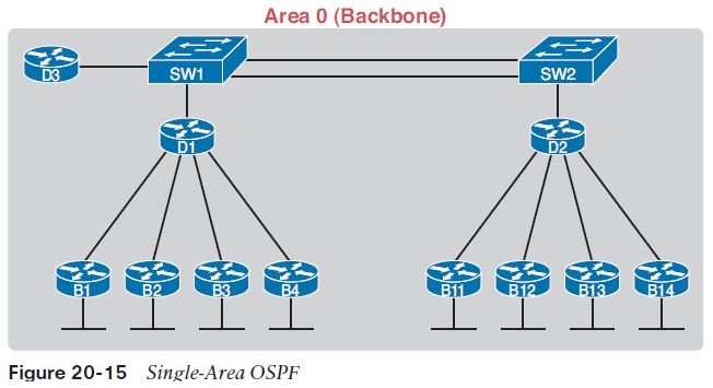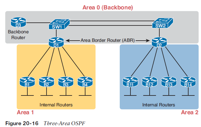 Now imagine a network with 900 routers, instead of only 11, and several thousand subnets. In that size of network, the sheer amount of processing required to run the complex SPF algorithm might cause convergence time to be slow just because of the time it takes each router to process all the math. Also, the routers might experience memory shortages. The problems can be summarized as follows: ■ A larger topology database requires more memory on each router.■ The router CPU time required to run the SPF algorithm grows exponentially with the size of the LSDB.■ With a single area, a single interface status change (up to down, or down to up) forces every router to run SPF again! OSPF provides a way to manage the size of the LSDB by breaking up a larger network into smaller pieces using a concept called OSPF areas.OSPF then creates a separate and smaller LSDB per area, rather than one huge LSDB for all links and routers in the internetwork. With smaller topology databases, routers consume less memory and take less processing time to run SPF. OSPF multi-area design puts all ends of a link—a serial link, and VLAN, and so on—inside an area. To make that work, some routers (Area Border Routers, or ABRs) sit at the border between multiple areas. Routers D1 and D2 serve as ABRs in the area design shown in Figure 20-16, which shows the same network as Figure 20-15, but with three OSPF areas (0, 1, and 2).Figure 20-16 shows a sample area design and some terminology related to areas, but it does not show the power and benefit of the areas. By using areas, the OSPF SPF algorithm ignores the details of the topology in the other areas. For example, OSPF on router B1 (area 1), when doing the complex SPF math processing, ignores the topology information about area 0 and area 2. Each router has much less SPF work to do, so each router more quickly finishes its SPF work, finding the currently best OSPF routes.