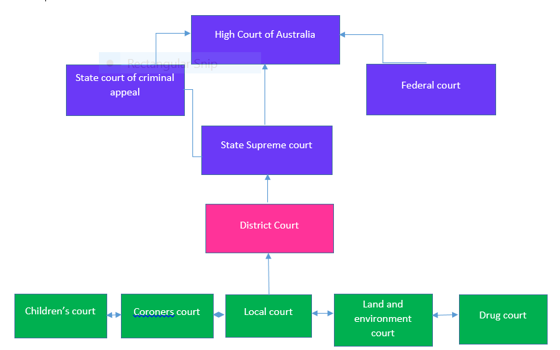 Local Court - magistrate, civil disputes up to $100 000 damage to property or injury. minor criminal matters eg- drink driving. a magistrate would reside over these cases. the coroners court investigates death by unnatural causes and suspected arson. children's court involves young children under 18 who have committed offenses . the land and environment court interpreting and enforcing environmental law. Drug court is a diversity program for people who have drug addictions. District court - heard b judges civil cases up to $750 000 and series criminal matters eg- armed robbery. also hears appeals from local court The Supreme court - highest court in NSW. civil cases over $750 000. the most series criminal matters eg- murder. heard by judge and jury. appeals from the 2 courts below The NSW court of criminal appeal - hears appeals from a convicted or sentenced person from the district court or supreme court. grounds for appeal are - a question of law - applied a law wrongly - a question of fact - evidence is incorrect - a challenge to the severity or adequacy of a sentence The High court - highest court, decisions are final. Jurisdiction over the constitution of Australia. also hears appeals Federal Court - Federal crimes are heard here. this includes family law and tax