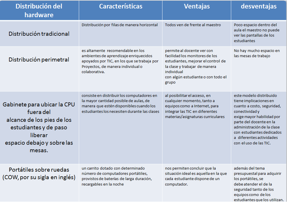 1. Realiza un cuadro comparativo sobre las diversas formas de distribuir el Hardware en los salones.