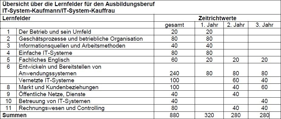Der vorliegende Rahmenlehrplan für die Berufsausbildung zum Informatikkaufmann/zur Informatikkauffrau ist mit der Verordnung über die Berufsausbildung im Bereich der Informations- und Telekommunikationstechnik vom 10. Juli 1997 (BGBl. I S. 1741) abgestimmt. Für den Prüfungsbereich Wirtschafts- und Sozialkunde wesentlicher Lernstoff der Berufsschule wird auf der Grundlage der ”Elemente für den Unterricht der Berufsschule im Bereich Wirtschafts- und Sozialkunde gewerblich-technischer Ausbildungsberufe” (Beschluß der Kultusministerkonferenz vom 18. Mai 1984) vermittelt. Der vorliegende Rahmenlehrplan geht von folgenden schulischen Zielen aus: Der Ausbildungsberuf Informatikkaufmann/Informatikkauffrau hat mit den anderen IT-Berufen (Fachinformatiker/Fachinformatikerin, IT-System-Kaufmann/IT-System-Kauffrau, IT-System-Elektroniker/IT-System-Elektronikerin) eine Basis gemeinsamer berufsübergreifender Qualifikations- und Bildungsziele (Kernqualifikationen, siehe Ausbildungsordnung). Diese Ziele beziehen sich auf Informations- und Telekommunikationstechnologien sowie betriebswirtschaftliche Geschäftsprozesse. Daneben gibt es berufsspezifische Qualifikations- und Bildungsziele (Fachqualifikationen, siehe Ausbildungsordnung). Diese Ziele bilden das eigene Berufsprofil. Die berufsübergreifenden und berufsspezifischen Qualifikations- und Bildungsziele sind nach Lernfeldern geordnet. Die Zielformulierung konkretisiert das jeweilige Lernfeld und ist handlungsorientiert formuliert. Die Inhalte sind so abstrakt gehalten, daß sie technische Weiterentwicklungen umfassen. Die Reihenfolge der Lernfelder, der Ziele, der Oberbegriffe und der Inhalte stellen keine inhaltliche und sachliche Gliederung dar. Die Vermittlung der Qualifikations- und Bildungsziele soll an exemplarischen berufsorientierten Aufgabenstellungen lernfeldübergreifend handlungs- und projektorientiert erfolgen. Die Geschäftsprozesse des Lernfeldes 2 werden im Lernfeld 6 an kaufmännischen Themen vertieft und informationstechnisch aufbereitet. Zum Berufsbild des Informatikkaufmanns/der Informatikkauffrau gehören insbesondere: Betriebswirtschaftliche, volkswirtschaftliche und organisatorische Grundlagen von Geschäftsprozessen, Kenntnis und Analyse des sozialen Umfeldes von Unternehmungen Projektbezogene Beschaffung, Auswertung und Präsentation von Informationen. Auswahl und Anwendung geeigneter Arbeitsmethoden. Nutzung von allgemein zugänglichen Informationsdiensten Kenntnis und Anwendung geeigneter Programmentwicklungsmethoden. Entwicklung von Datenbankkonzepten auf Grundlage des Projektmanagements, bekannter Datenbankmodelle und geeigneter Datenbankentwicklungsumgebungen Definition und Analyse von Benutzeranforderungen im Kontext eines Beschaffungsprozesses für einfache und vernetzte Informations- und Kommunikationssysteme. Kenntnis der informationstechnischen Grundlagen, des Aufbaus und der Funktionsweise von IT-Systemen. Benutzerorientierte, sowohl auf die Fachabteilung als auch auf das DV-Konzept der Unternehmung abgestimmete Konfiguration von IT-Systemen. Inbetriebnahme und Nutzung von einfachen und vernetzten Informations- und Kommunikationssystemen. Integrative Anwendung englischer Fachbegriffe.