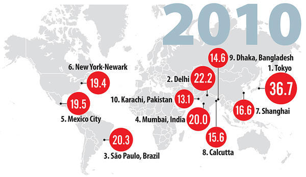 How the rise of the megacity is changing the way we live: "The rapid increase in the number of cities home to more than 10 million people will bring huge challenges … and opportunities... " It's not just that more people now live in cities than in the rural countryside (for the first time in human history). It's not just that major cities are growing increasingly more important to the global economy. The rise of the megacities (cities over 10 million inhabitants) is a startling new phenomenon that really is something we've only seen in the last 50 years or so with the expectation that the number of megacities will double in the next 10 to 20 years (currently there are 23). This reorganization of population entails wholesale restructuring of the economic, environmental, cultural and political networks. The urban challenges that we face today are only going to become increasingly important in the future.