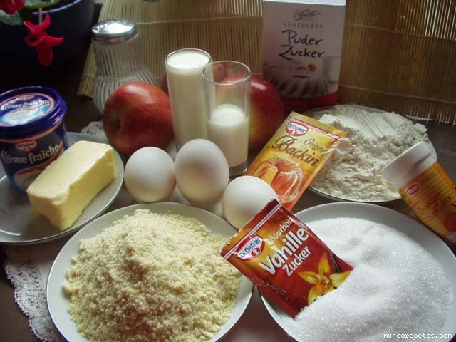 .Osagaiak: 1.Sagar kremarako: 800gr. golden sagarra zati txikitan zatitua. 2 leka bainilla. 0.75 dl ur. 30 gr. gurin. 2. Oinarrirako:370gr. irin.310 gr. azukre.1 arraultz.2 arraultza gorringo (gorringo bat tarta pintatzeko).15 gr. legamia hautsean.20 gr. azukre abanillatu.Ron pixka bat.Gatz pixka bat.