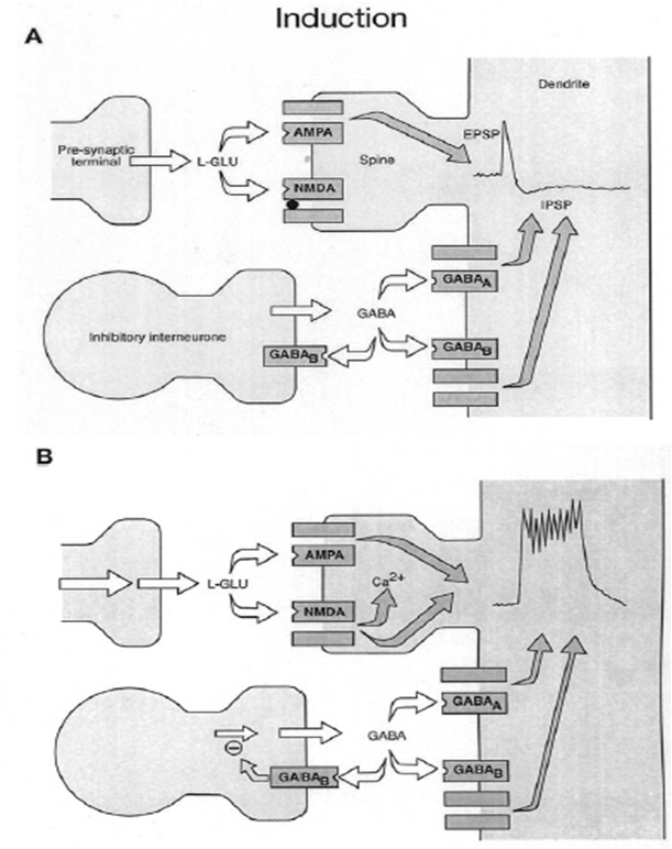 Figure 10–7. Activation of NMDA receptors, modulated by other ionotropic amino acid receptors, triggers the induction of LTP in principal cells of area CA1 and dentate gyrus. A. Low-frequency stimulation of Schaffer commissural axons evokes an EPSP that is mediated by L-glutamate acting on AMPA receptors. The EPSP is followed by a biphasic IPSP, produced by glutamatergic excitation of feedforward GABAergic interneurons. The early part of the IPSP is due to activation of GABAA receptors, which are permeable to Clions; the slow component of the IPSP reflects activation of GABAB receptors, indirectly coupled to K channels. Because of its slow kinetics and the voltage-dependent block of its channel by Mg2 ions, the NMDA receptor contributes little to the EPSP at low frequencies of stimulation. B. During high-frequency stimulation, the activated spines become strongly depolarized with the result that the Mg2 block of the NMDA receptor channel is relieved, allowing Ca2 to permeate through the receptor. Factors that contribute to sustained depolarization, including temporal summation of EPSPs and the accumulation of Cl- in the spine and K in the synaptic cleft, leading to depolarizing shifts in reversal potentials. Some protocols, in particular theta burst stimulation, depend for their efficacy on the suppression of inhibition mediated via GABAB autoreceptors on inhibitory terminals. The suppression of GABA release reaches a maximum around 200 ms after a priming stimulus, explaining the peculiar efficacy of priming and theta burst stimulation (see text). (Source: After Bliss and Collingridge (1993).