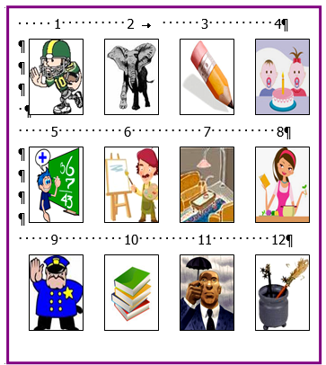 Look at the pictures and answer the question 1. Is he a teacher? No, he is not._ ____ 2. Is it an elephant? _______________________ 3. Is it a pencil? _______________________ 4. Are they twins? _______________________ 5. Is he in the park? ___________________________ 6. Is he a painter? ___________________________ 7. Is Ricky in the living room? ___________________ 8. Is mom in the kitchen? ___________________ 9. Is your dad a postman? ___________________ 10. Are the books on desk? __________________ Are you Mrs. Perkins?