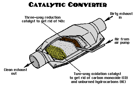 Solution: Catalytic ConverterHow it works: Catalysts in catalytic converters are also able to oxidize unburned hydrocarbon fuels Converts them into CO2 and H2O Formula:CxHy (g) + ___ O2 (g) --> x CO2 (g) + y/2 H2O (l)