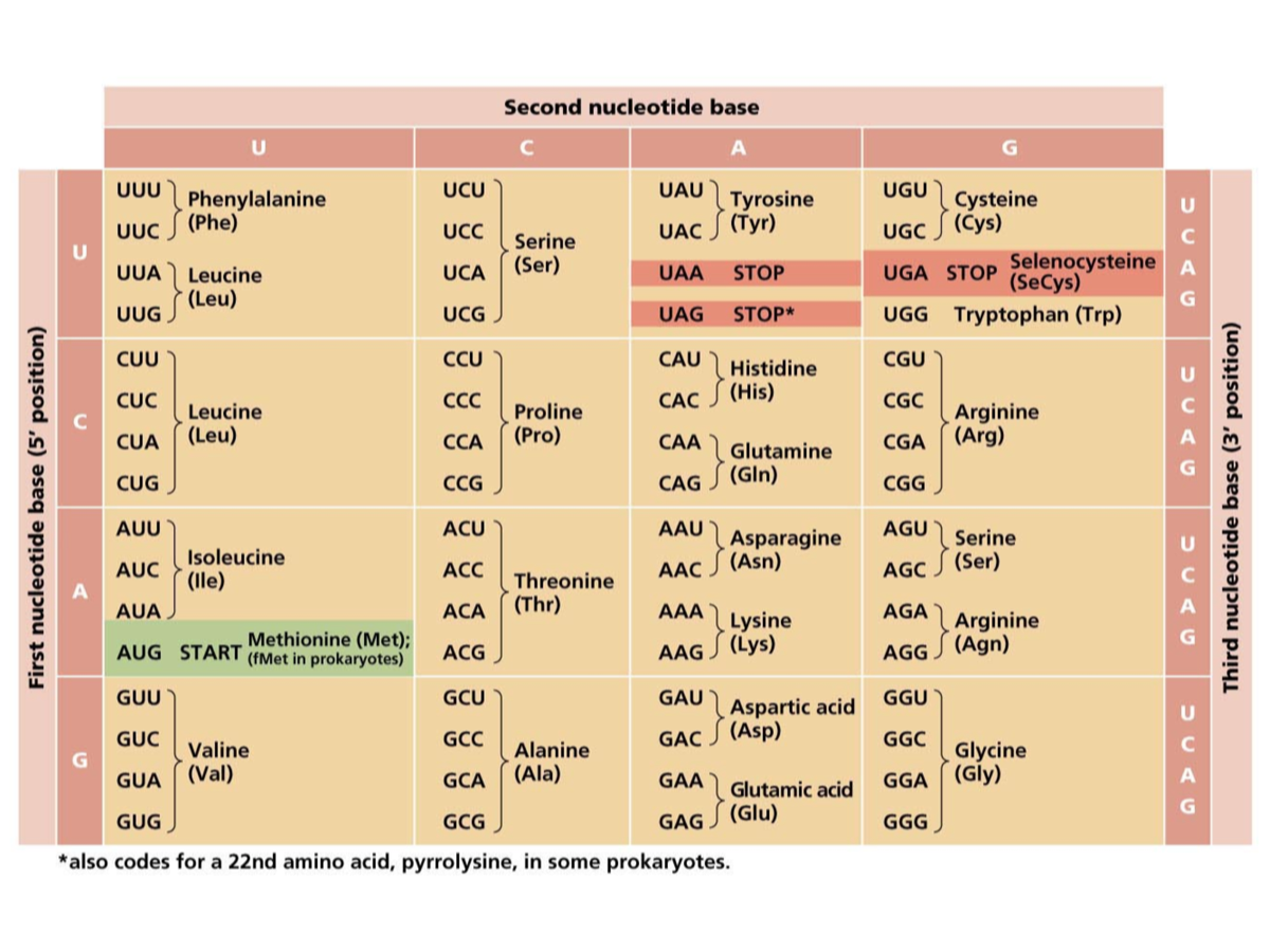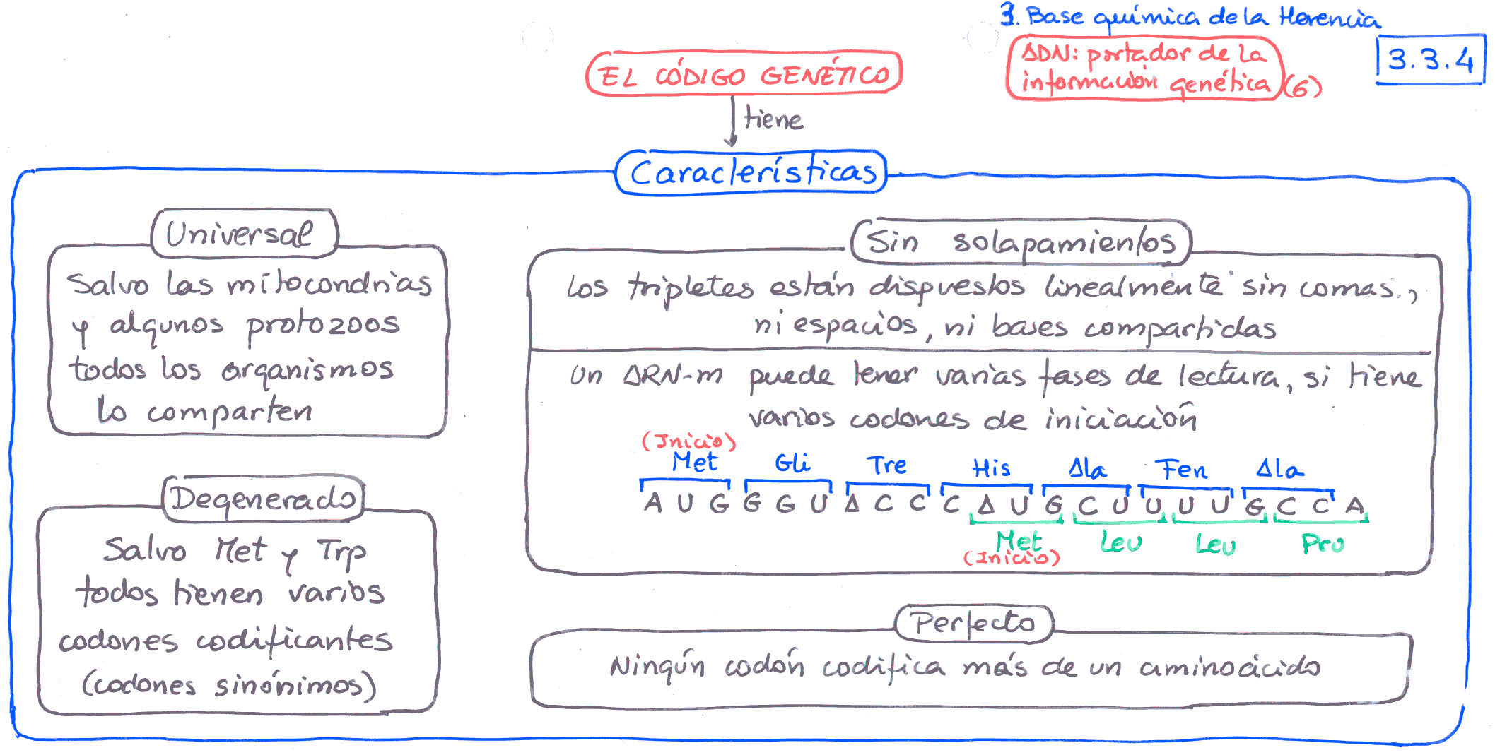 Las características del código genético son: (1): ES UNIVERSAL. EL código genético es compartido prácticamente por todos los organismos de modo que cada codón siempre llama al mismo aminoácido. De este modo un ARNm de la especie 1 incluido en el citosol de una célula de la especie 2, fabricará la proteína de la especie 1. La universalidad del código genético indica un origen evolutivo común. No obstante, existen excepciones ya que la lectura del código genétio no es igual, por ejemplo, en las mitoconrias o en algunos protozoos. (2): ES DEGENERADO. Este término indica que la mayor parte de los aminoácidos, a excepción de la metionina (Met) y el triptófano (Trp), están docificados por más de un codón. Los codones que llaman al mismo aminoácido se denominan codones sinónimos. (3): NO PRESENTA IMPERFECCIÓN. Cada codón llama a su aminoácido específico, es decir, ningún codón puede llamar a más de un aminoácido. Aquí radica la especificidad de la lectura del ARNm: cada ARNm (una vez madurado completamente) sólo tiene información para fabricar una determinada proteína siempre y cuando su lectura comience en el mismo punto. (4): CARECE DE SOLAPAMIENTO. Los tripletes de baes se hallan dispuestos de manera lineal y continua, sin que entre ellos existan comas ni espacio, y sin que compartan ninguna base nitrogenasa. Sí que existe la posibilidad de que un mismo ARNm contenga varios puntos de inicio por lo que podría fabricar diferentes cadenas polipeptídicas. (5): CODONES STOP. Son los codones que determinan el fin de la lectura del ARNm por parte del ribosomas. SOn tres: UAA, UGA, UAG.VÍDEOS KHAN ACADEMYhttps://www.youtube.com/watch?v=dijqYyFY1GMhttps://www.youtube.com/watch?v=DvgHLz7aoSg