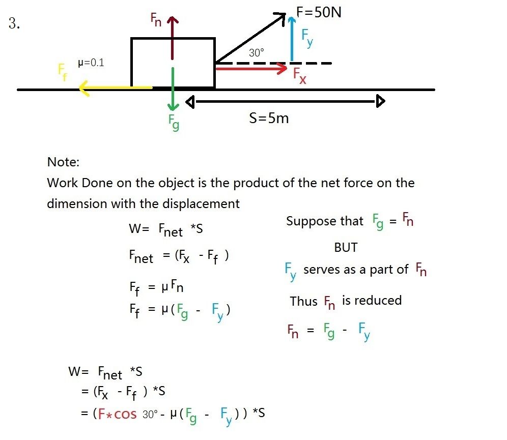 Work is the product of Force and DisplacementW=F*SJust remeber: IF the DISPLACEMENT is cause by INERTIA and not by FORCE then there is NO WORK DONE on the object. IF the FORCE cannot cause DISPLACEMENT such as hold the object in the middle of the air, then there is no WORK DONE on the object.