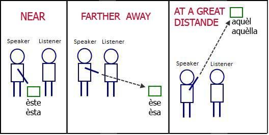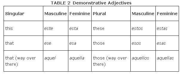 Demonstrative Adjectives Demonstrative adjectives are those adjectives whose function is to point at something. In English, the singular demonstrative adjectives are "this" and "that," while their plurals are "these" and "those," respectively. Like English, Spanish has three sets of demonstrative adjectives, which vary by number and gender. In Spanish, the third set of demonstrative adjectives is 'Aquel'. This refers to something 'over there' or something a long time ago in the past. Demonstrative adjectives go before the nouns that they refer to: e.g. Me gusta este perro. (I like this dog.) or Voy a comprar ese coche. (I'm going to buy that car.)