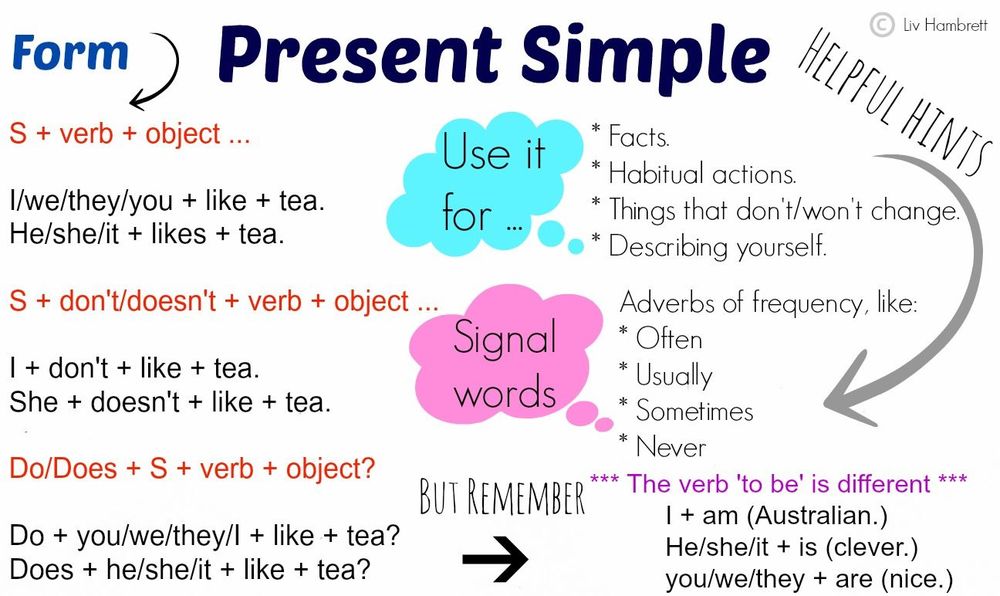 In PRESENT SIMPLE we use or (he/she/it) for negative sentences , questions and add - or - for the person singular (he/she/it) in regular sentences.