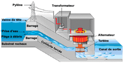 Énergie hydraulique (eau) --> Énergie mécanique (rotation de la turbine) --> Énergie thermique (alternateur)