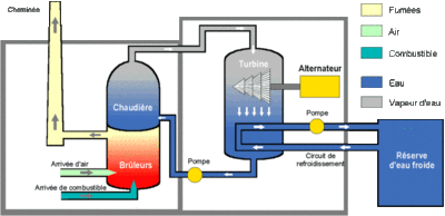 Énergie fossile (charbon) --> Énergie thermique (chaudière) --> Énergie électrique (alternateur)