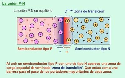 Los electrones libres de la capa del semiconductor n, entran instantáneamente en la capa del semiconductor p, entra una carga positiva en la región n (porque faltan electrones) y una carga negativa en la región en p (porque los huecos han desaparecido)