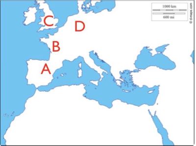 Laquelle des lettres sur la carte ci-dessous correspond à l'endroit où commence l'industrialisation?