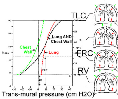 This graph is depicting the relationship between transmural pressure and lung volume. The trasmural pressure is the result of opposing recoil of the chest wall (green line) and lung (red line), thus trasmural pressure is the black line