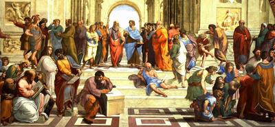 Na imagem, há dois filósofos no centro. Quais são eles?