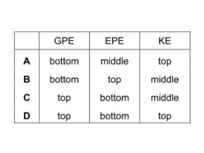 At which points in the path of the mass do the gravitational potential energy of the mass (GPE), the elastic potential energy in the spring (EPE) and the kinetic energy of the mass (KE) have their highest values?
