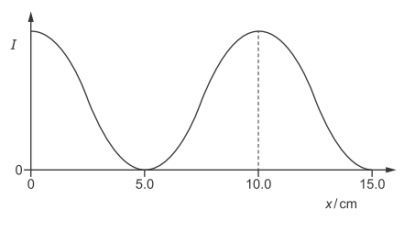 The variation with distance x of the intensity I along a stationary sound wave in air is shown by the graph.