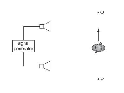As the student walks from P to Q, he notices that the loudness of the sound rises and falls repeatedly.