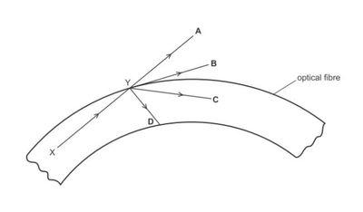 A ray of light travels from X to Y along an optical fibre. The angle of incidence at Y is greater than the critical angle.