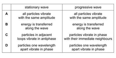 The table contains statements about stationary and progressive waves. Which row is correct?