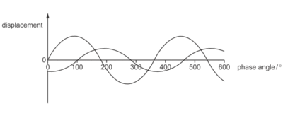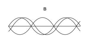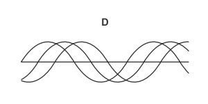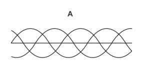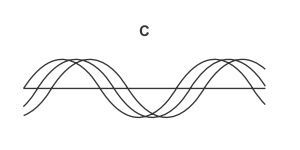 The three waves shown in each diagram have the same amplitude and frequency but differ in phase.