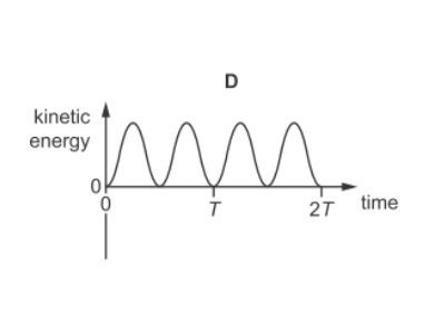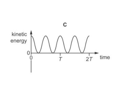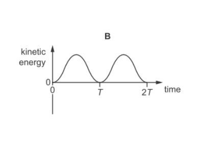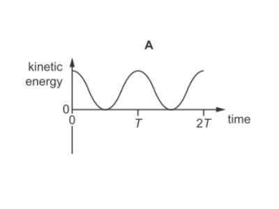 When sound travels through air, the air particles vibrate. A graph of displacement against time for a single air particle is shown. Which graph best shows how the kinetic energy of the air particle varies with time?