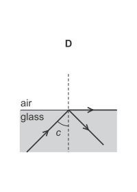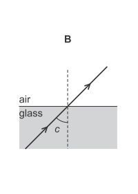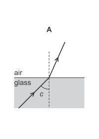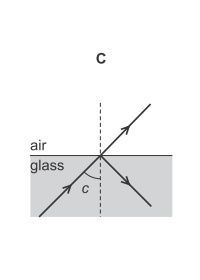 A ray of light in glass is incident on the surface at an angle c. The angle c is the critical angle.