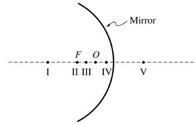A spherical, concave mirror is shown in the figure above. The focal point F and the location of the object O are indicated. At what point will the image located?