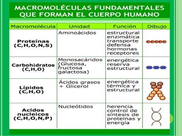 Éstos monómeros forman los cuatro tipos basicos de macromoleculas : Las proteínas, los ácidos nucleicos, los carbohidratos y los lípidos