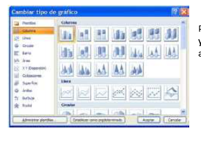 Gráficas circularesTienen como función la expresión de datos y destacar un sector del gráfico.Gráficos linealesSe suelen aconsejar en fenómenos de tipo científico o dependientes de la magnitud del tiempo . Gráfico seleccionado>Presentación>Línea de tendencia> Valor R cuadrado en el gráfico/ninguna.Gráficos de dispersiónDescriben como nube los datos conjuntos de dos variables X-Y. En una nube de puntos se puede añadir una tendencia.Herramientas de Gráficos>Barras de Error. Tanto X como Y