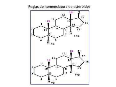 El núcleo de esteroide es bastante rígido con una estructura prácticamente plana. Las sustancias derivadas de este núcleo poseen grupos metilo (-CH3) en las posiciones 10 y 13, que representan los carbonos 18 y 19, así como un carbonilo o un hidroxilo en el carbono 3; generalmente existe también una cadena hidrocarbonada lateral en el carbono 17; la longitud de dicha cadena y la presencia de metilos, hidroxilos o carbonilos determinan las diferentes estructuras de estas sustancias