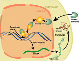 Son hormonas lipofílicas que atraviesan libremente la membrana plasmática, se unen a un receptor citoplasmático, y este complejo receptor-hormona tiene su lugar de acción en el ARN del núcleo celular, activando genes o modulando la transcripción del ADN.