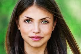 She is beautiful, has big green eyes, long straight hair, has a big mouth and a small nose. The picture according to the description is: