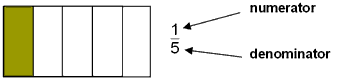 The rectangle in one-fifth (1/5) shaded because there are five equal-sized parts in the whole and one of them is shaded.