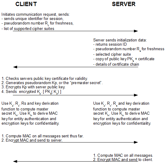 High level summary of the SSL handshake protocol The client sends a request to server for a secure connection. Request includes: session ID, pseudorandom number for freshness, and a list of cipher suites supported. The server responds with the session ID, it's own pseudorandom number for freshness, the selected cipher suite, a copy of its public key certificate and details of the certificate chain. The client should check the certificate's validity. If good, then the client creates a key that will be encrypted using the server's public key. This key is called the premaster secret and will be used to derive the keys to secure the session. The client encrypts the premaster secret with the server's public key, and sends it to the server. Both the clent and the server then use the premaster secret and the two freshness values and a key derivation function to derive symmetric encryption keys and a MAC key. The client then creates a MAC of all of the messages that have been sent thus far and encrypts that using the derived symmetric key. This is sent to the server as a "finished" message. The server then creates a MAC of all the messages sent thusfar and and encrypts the MAC and sends it to the client as a "finished" message.