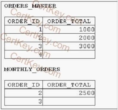 View the Exhibit and examine the data in ORDERS_MASTER and MONTHLY_ORDERS tables. Evaluate the