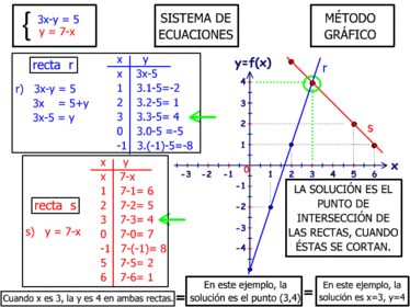 | Método de eliminación (o de suma-resta): Consiste en multiplicar cada ecuacion por un numero adecuando de modo que, al sumar ambas ecuaciones, una de las incógnitas desaparezca obteniéndose así una ecuacion con una incógnita cuyo valor se determina y se usa para encontrar el valor de la otra incógnita | Determinar el punto de intersección de las rectas de ecuaciones: 2x-y+5=0 y 3x-4y+7=0 2x-y=-5 3x-4y=-7 Por el método de eliminación, se considera un nuevo sistema: {-8x+4y=20 {3x-4y=-7 Se multiplica la primera ecuacion por -4 -5x=13 se suma ambas ecuaciones x=-13/5 se despeja x 2(-13/5)-y=-5 se sustituye el valor de x en la primera ecuacion -26/5+5=y y=-1/5 despejando y se concluye que la solucion del sistema es (-13/5,-1/5) y por lo tanto, las rectas se cortan en ese punto |