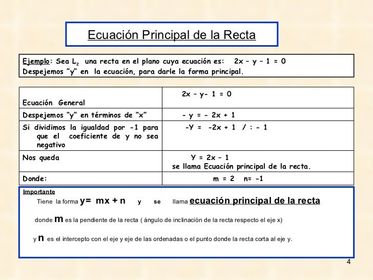 | La ecuación de la recta: dados dos puntos en el plano existe una única recta que los contiene, si la recta no es vertical, osea paralela al eje y, entonces se puede asignar un numero que mide su inclinación este numero se llama pendiente de la recta | |