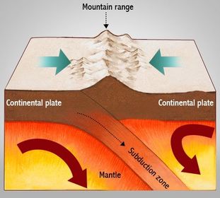 | Collision Plate Margins Fold mountains and earthquakes | Two plates of equal density push toward each, in result fold mountains are created. Examples: The Alps |