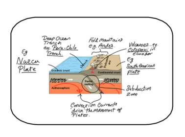 | Destructive Plate Margin Earthquakes, fold mountains and volcanoes | Heavier plate subducts causing magma to increase pressure causing fierce volcanic eruptions |